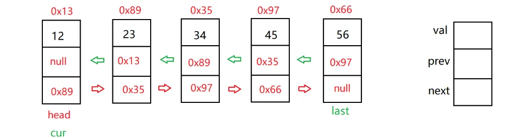 以下图片即为双向链表结构,包含了 val、prev 前驱、next 后驱以及 head 头指针和尾指针
