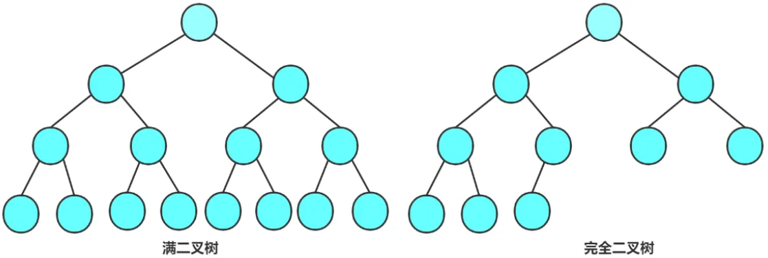 - **满二叉树:**一棵二叉树,若每层的节点树都达到最大值,则这棵二叉树就是满二叉树。从数学关系上看,一颗二叉树的层数为 K,则节点总数为 2k- 1,则它就是满二叉树。