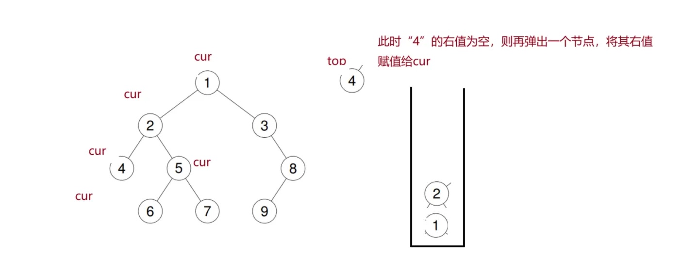 - 向左时一路压栈一路打印,直至 cur == null 时,再弹出前一个节点,将其右索引赋值给 cur 并将其进行循环(将 cur 视为另一子树的根节点即可理解)