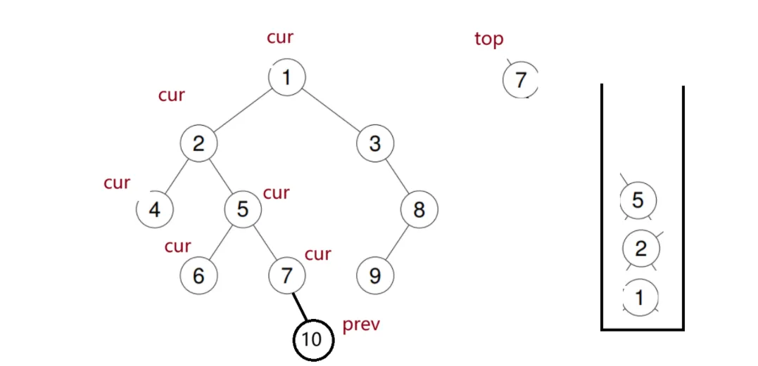 如上图,当 cur 走到 7 时,假设还存在右值“10”,直至走完 “10”,随后弹出 7,又会再次走到判断 7 是否存在右值,因此进入死循环。