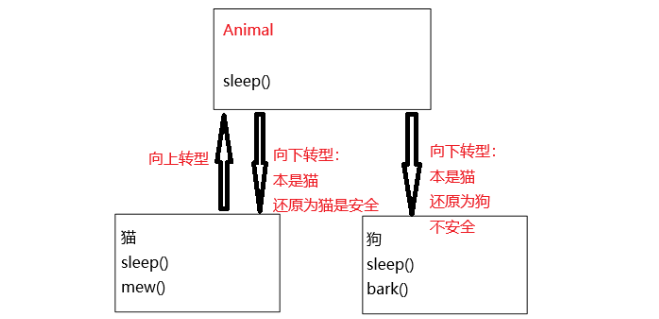 - 向下转型:你把 “手机” 强行当成 “iPhone” 用,只有当它本来就是 iPhone 才行,如果本来是 “小米”,那么立马报错。